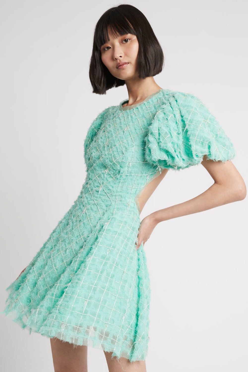 Context embellished minidress from Aje featuring green, cotton, criss-cross embellishment, round neck, short puff sleeves, rear button and loop closure, open back and concealed centre back zip.