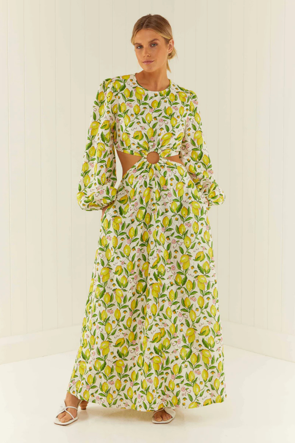 Crafted from a premium hand drawn lemon printed Linen, this maxi dress features billowing blouson sleeves and a cut out back with elegant tie detailing for support.