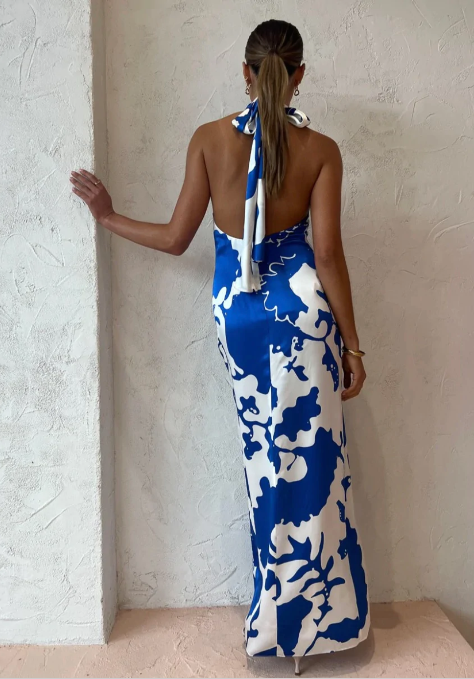 The Esme halter dress, a long line maxi dress with a halter neckline, crafted in 100% silk printed in our SIR. exclusive Merce abstract print. Features an open back, tie detail and centre front slit.