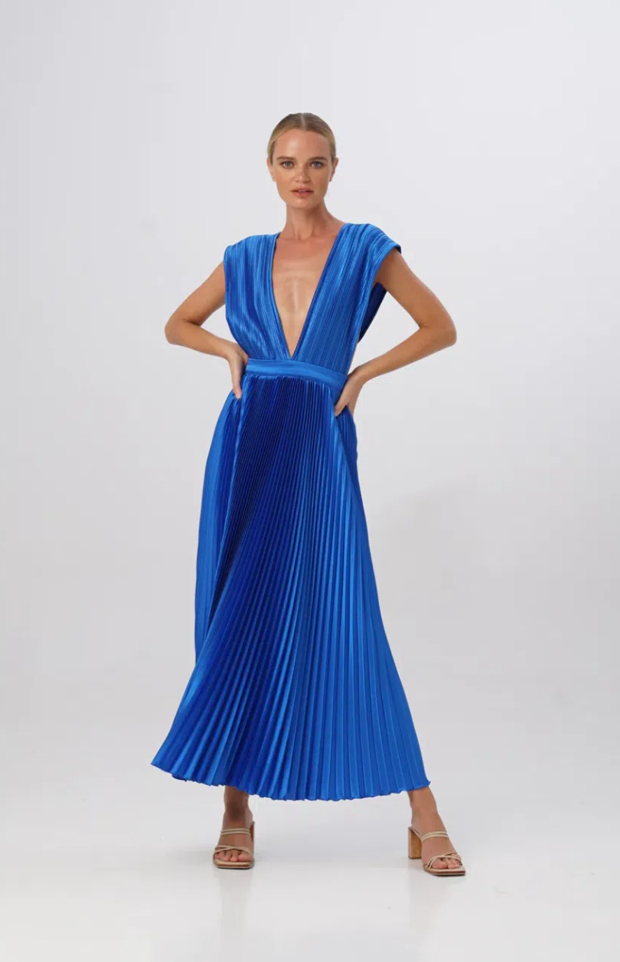 This silhouette for the soirée to remember. The gown features an exquisite deep neckline that softens into a dramatic umbrella pleat skirt, falling softly from the waist to the ankles.