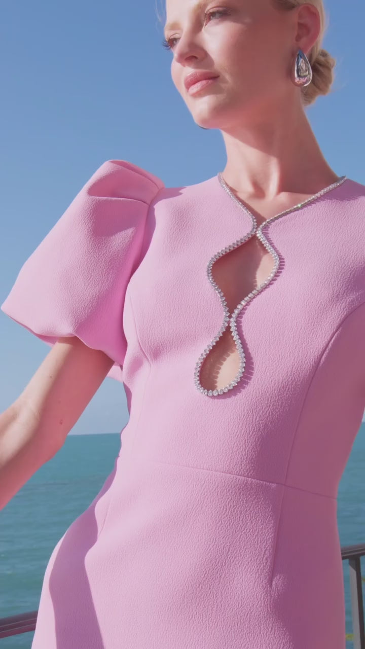 The Karina Puff Sleeve Mini Dress is a stunning pink addition to your wardrobe. Featuring voluminous puff sleeves, a fitted bodice with front cut outs, and diamante trim, this chic dress is bound to captivate attention at your next event. The A-Line dress is lined with a zip fastening at the back, perfectly blending comfort and sophistication. The rounded neckline and cinched waist add playful elements, forming a feminine & flattering silhouette.