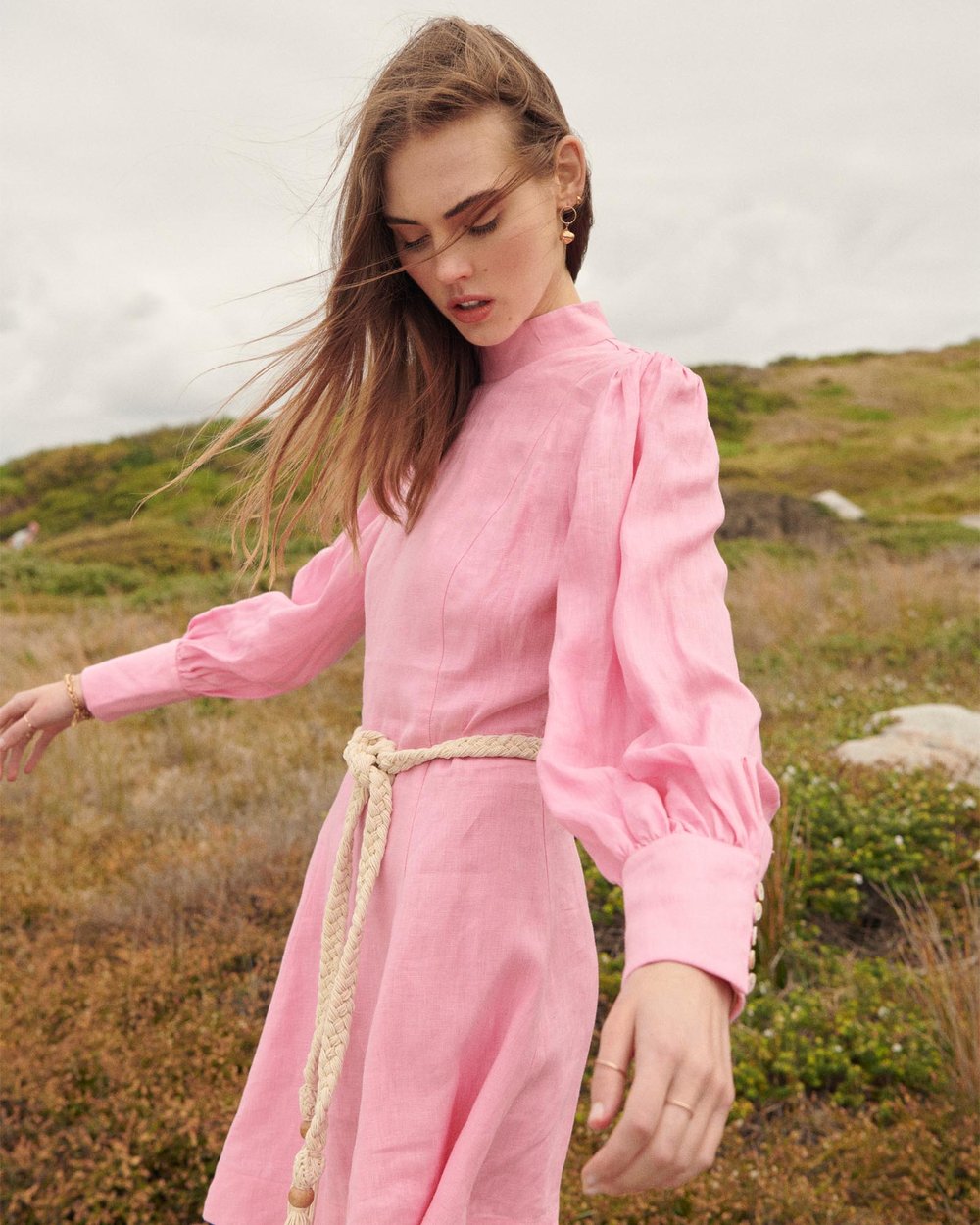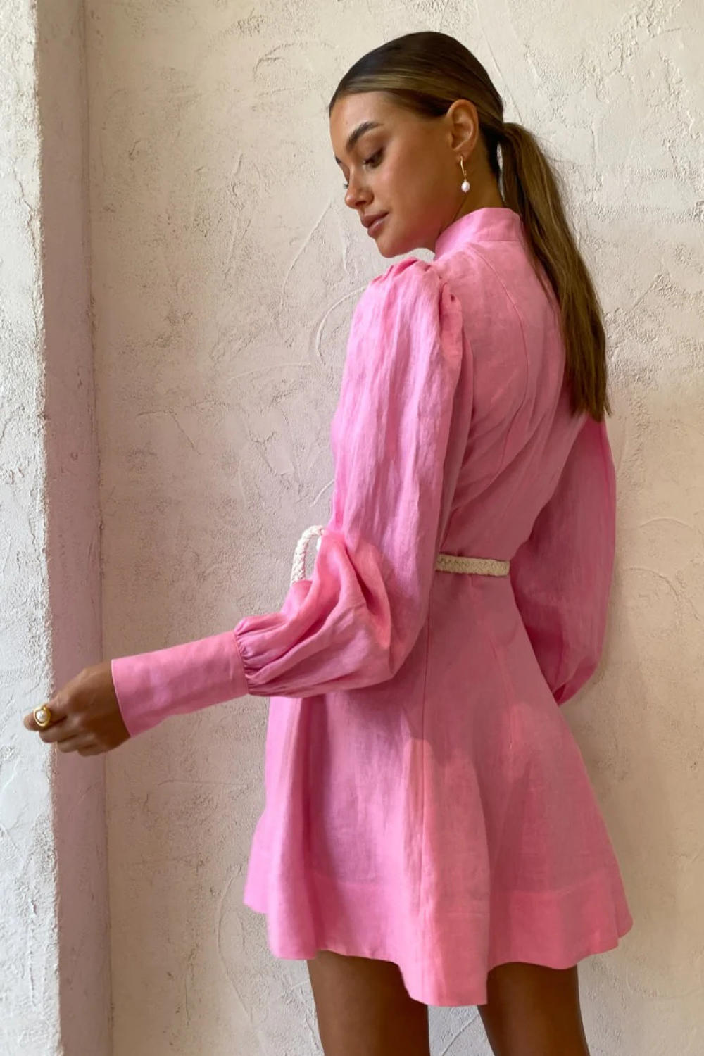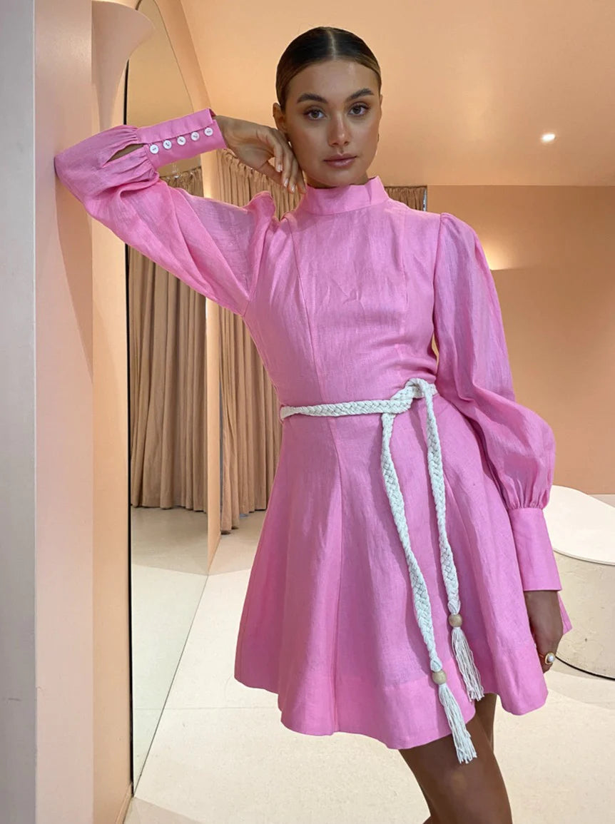 Crafted from a lightweight linen fabrication, this playful pink mini dress sits fitted through the body. It features long blouson sleeves, buttoned cuffs and a high neckline before falling into a voluminous mini skirt silhouette.
