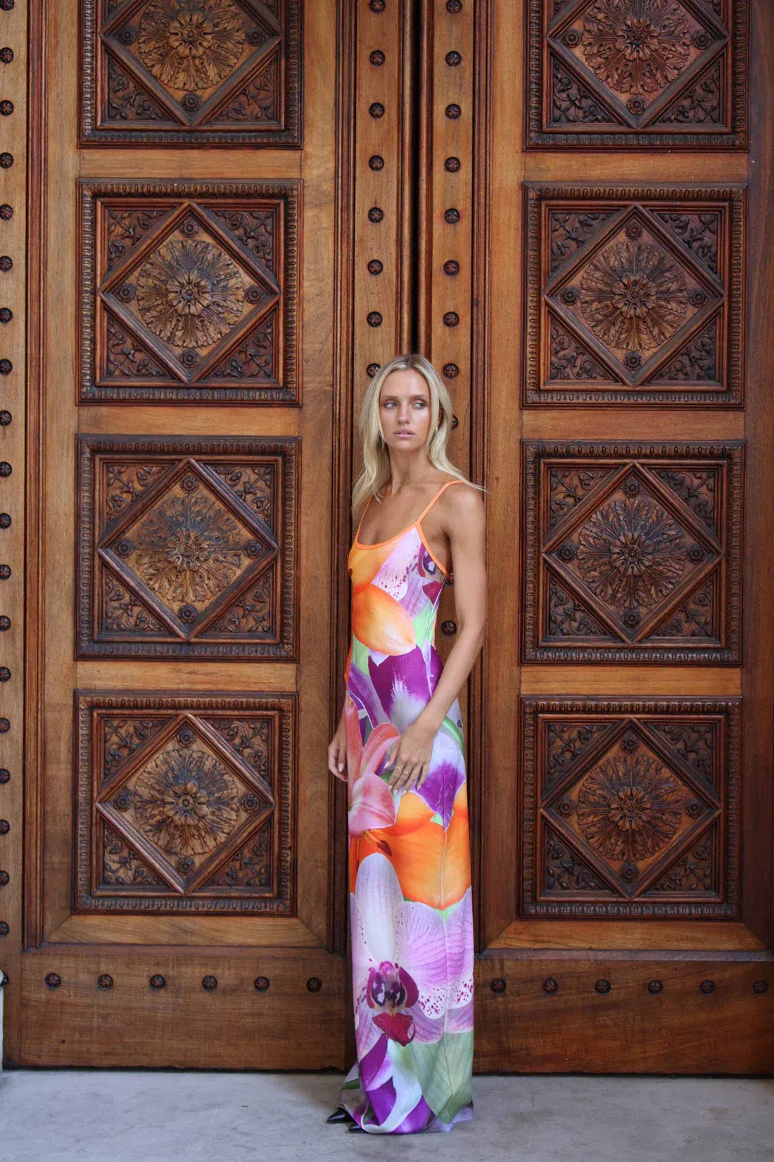 The Riviera Slip Dress is alluring and evocative with a sleek silhouette. This original designed print is encapsulated on our figure-hugging signature maxi that features adjustable straps, a round neckline, and a rear split.